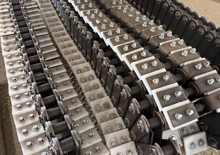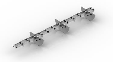 Elemento central do sistema, as correntes são responsáveis por tracionar e arrastar o material ao longo do duto. Disponíveis em aço carbono ou inoxidável, são projetadas para suportar operações severas, com máxima resistência à abrasão e desgaste. As taliscas (também conhecidas como raspadores) proporcionam movimentação contínua e controle eficiente do fluxo de produto, com mínima retenção de resíduos.
